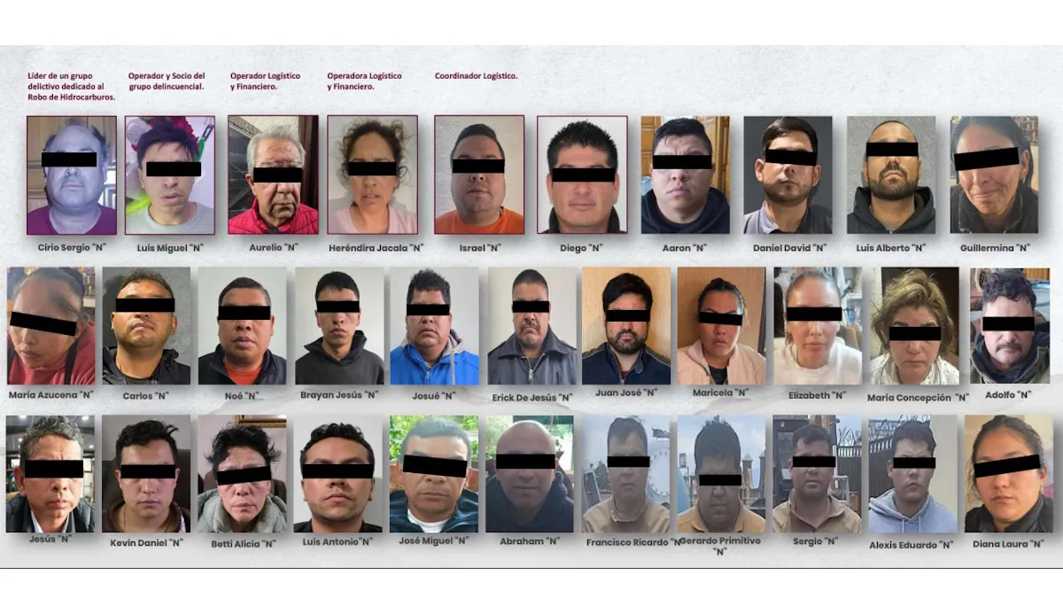 Después de seis meses de investigación, se ejecutaron 12 cateos y 6 órdenes de aprehensión, lo que dejó 32 personas detenidas, incluyendo a los jefes del grupo: Cirio Sergio ‘N’, Luis Miguel ‘N’, Aurelio ‘N’, Heréndira Jacala ‘N’ e Israel ‘N’, todos con roles clave en logística, finanzas y operación.